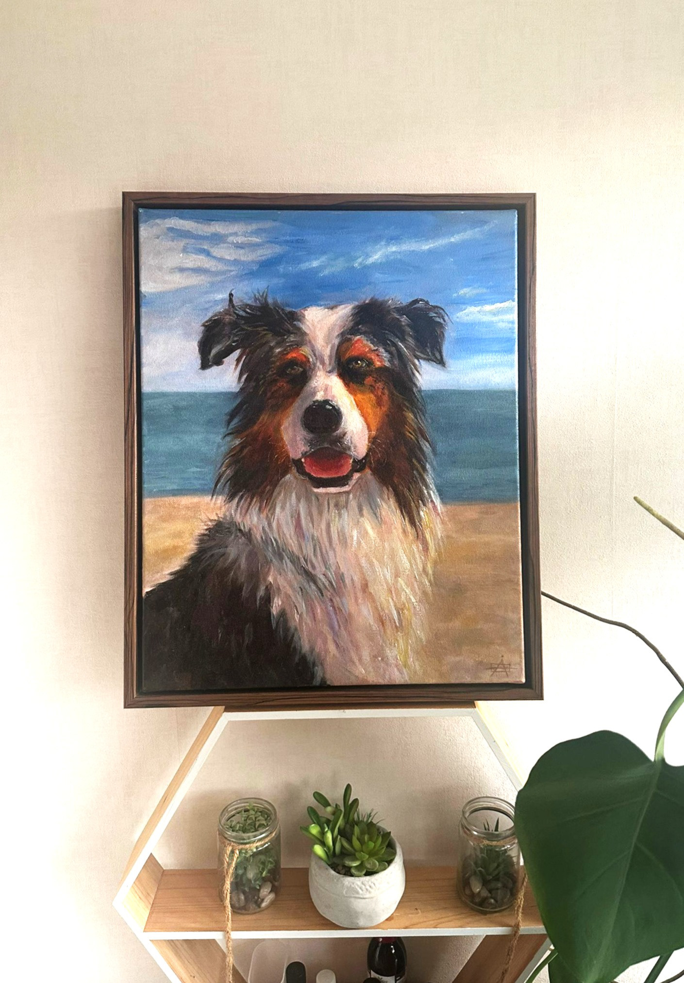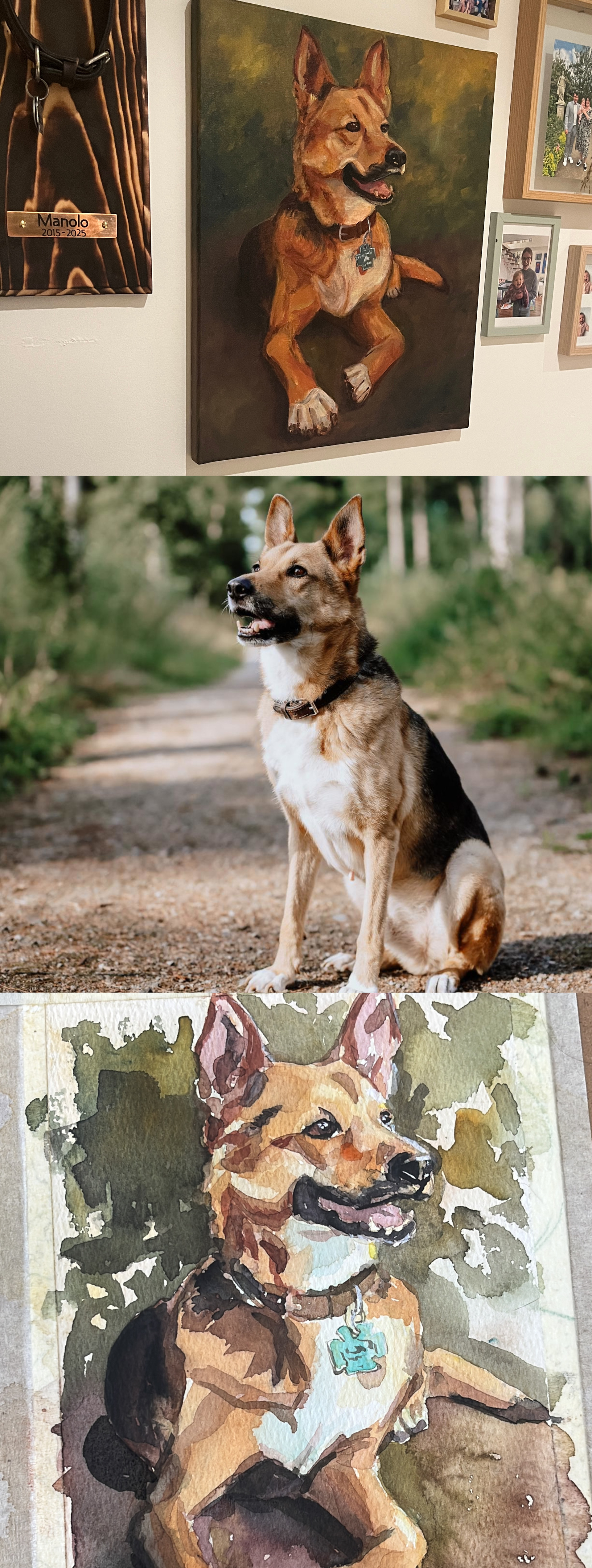 Dieses Ölportrait zeigt Manolo – ein treuer Begleiter, dessen Wesen so ruhig wie stark war. Seine wachsame, freundliche Art und die tiefe Wärme in seinem Blick sollten genau so bewahrt werden, wie sie im Leben spürbar waren. Das Werk hängt nun im Zuhause seiner Familie – als liebevolle Erinnerung und Teil ihres Alltags.