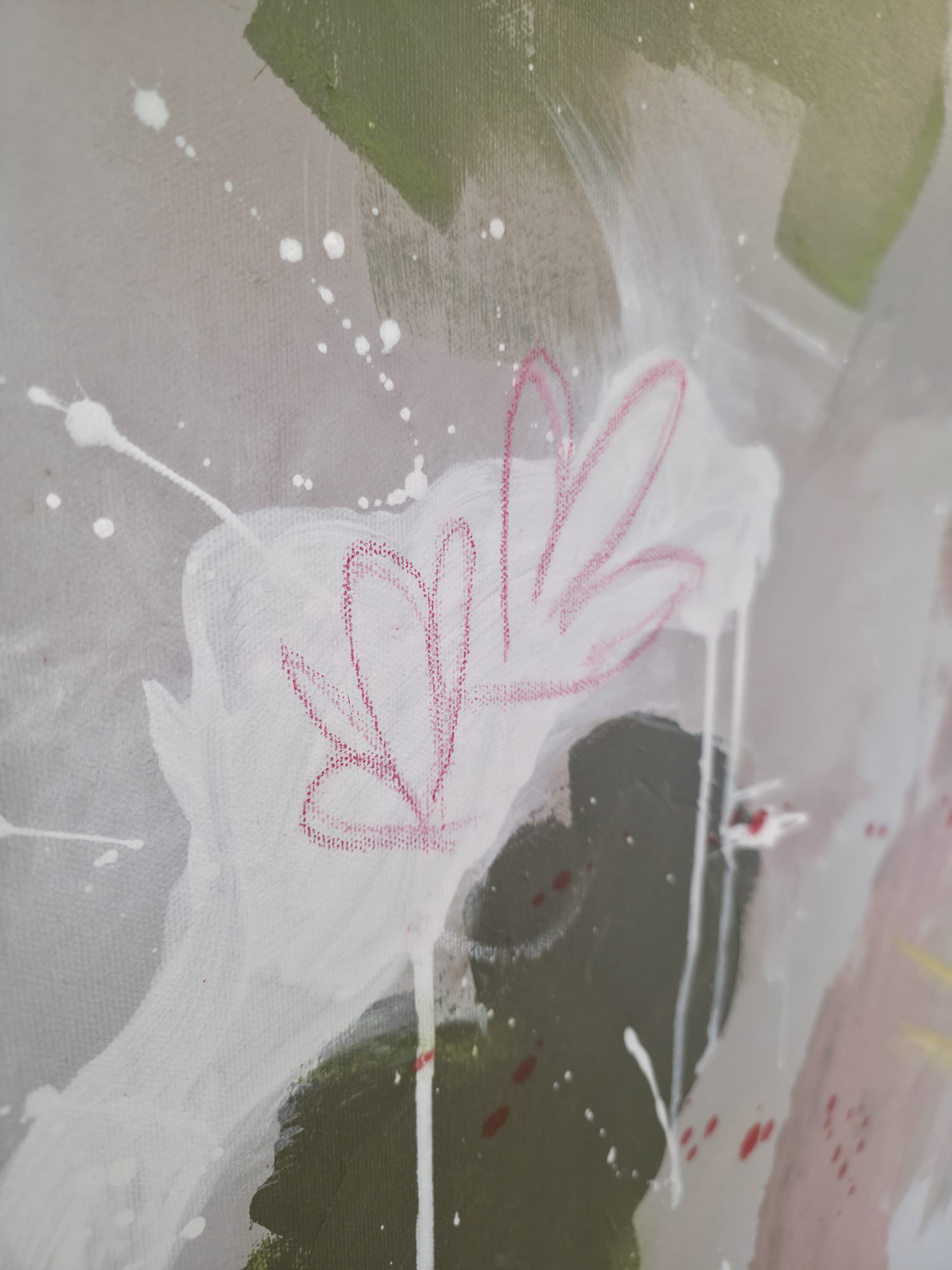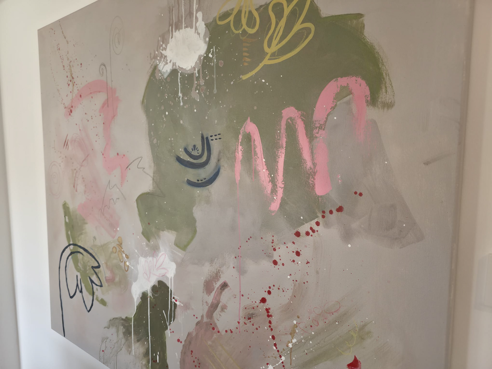Dieses Muldimedia-Auftragswerk entstand in Zusammenarbeit mit der Kundin für das Esszimmer eines modern und minimalistisch eingerichteten Hauses. Die Hintergrundfarbe wurde eigens auf das warme Grau der Einrichtung abgestimmt, sodass sich das Bild harmonisch in den Raum einfügt. Mit seiner abstrakten, lebendigen Formensprache bricht es die klare Ordnung der Umgebung auf eine ruhige, natürliche Weise – es bringt Bewegung ins Gleichgewicht. Das Werk misst etwa 1 × 1,5 Meter und entfaltet seine Wirkung als zentrales Element im Raum.